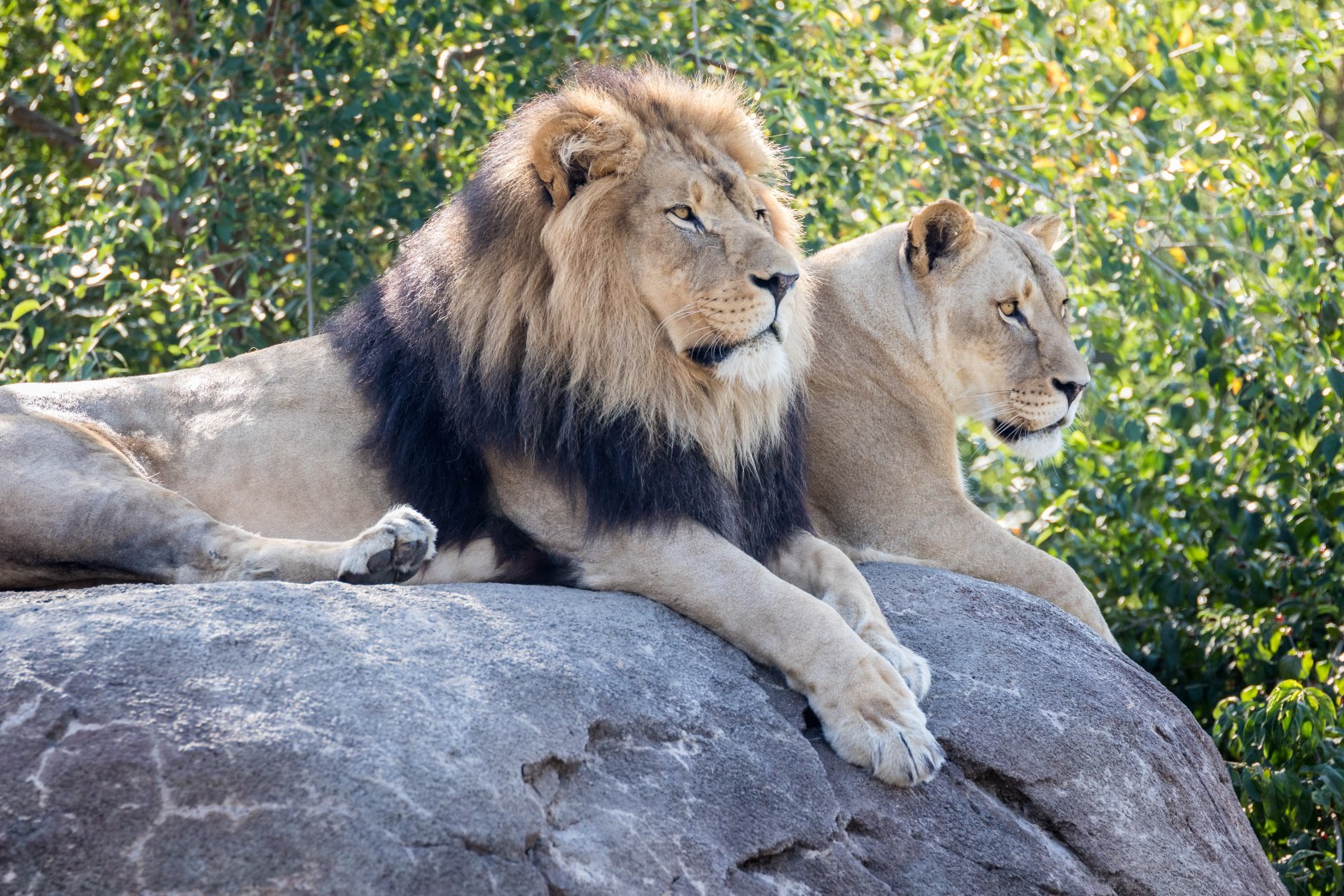 Male and female lion sitting on a rock.